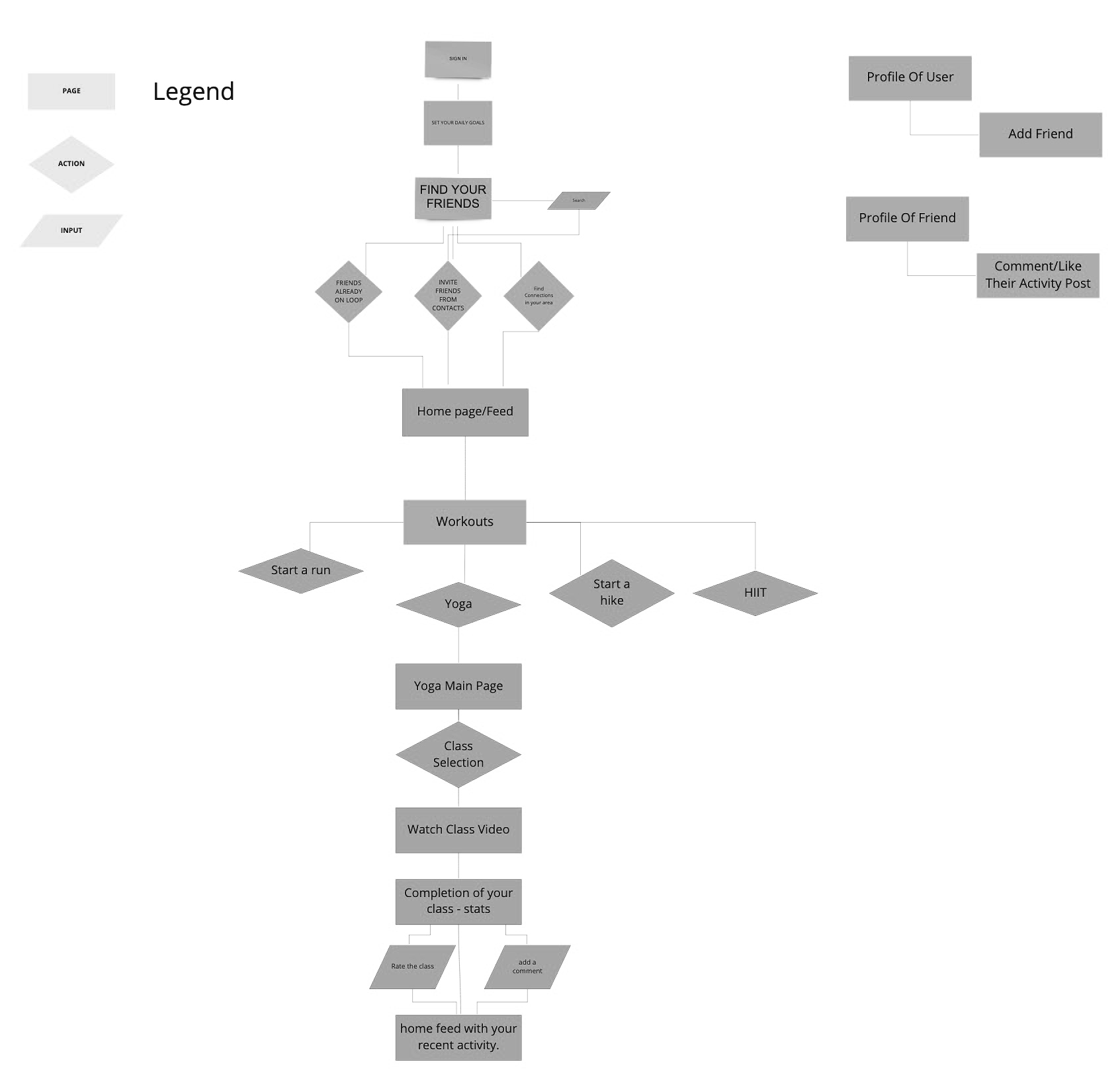 The main features I wanted to create were, an easy way of finding and new connections in your local area. The ability to set customizable goals, and a home feed that acts like a leaderboard showcasing various activities and accomplishments made connections. Since the majority of users I interviews currently track their progress on app which also provide workouts, I thought it was integral to add workout classes to the app itself. This way users can exercise and track in one place.