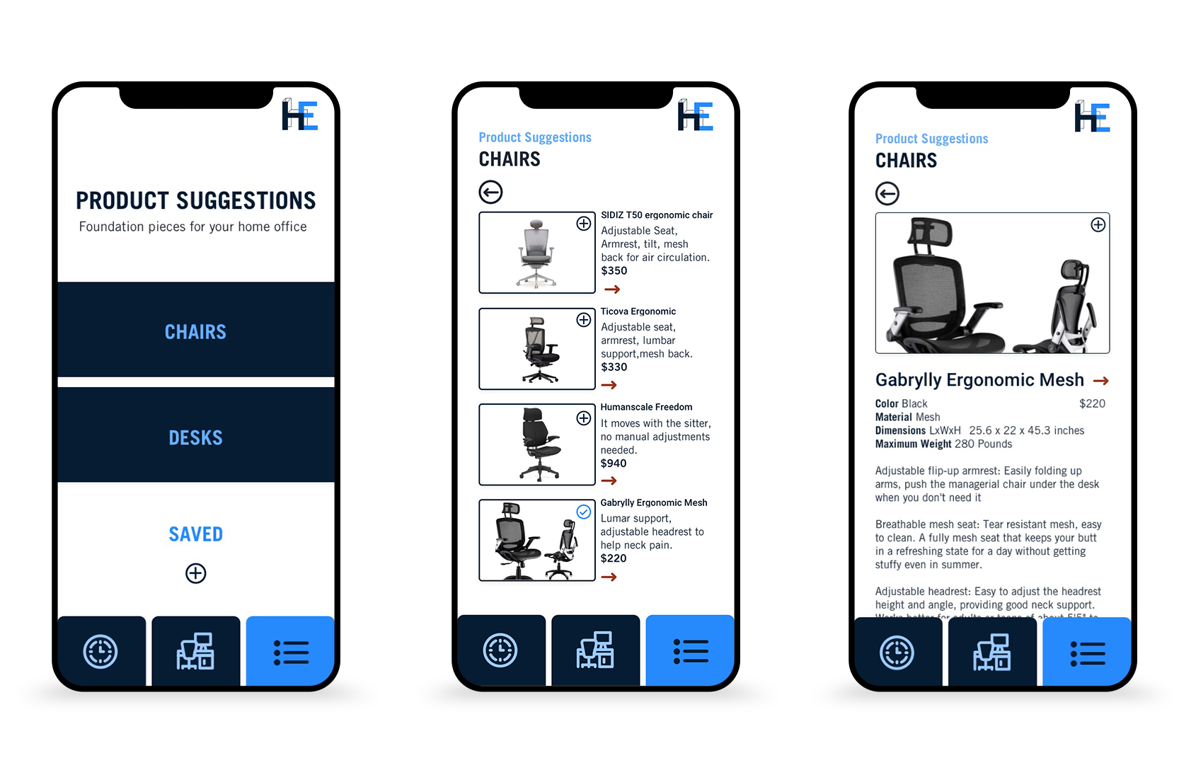 I wanted this app to give a sense of ease and reliability, I wanted a convey a savvy and minimalist aesthetic. Homergo is friendly while empowering users to change their lives for the better through education and presentation of curated products to best suit their needs. Style guide created here.