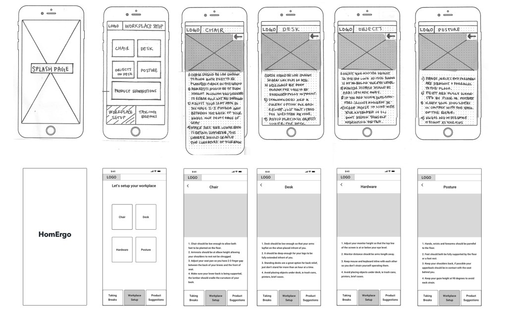 Using my 3 problem statements as top priorities. I created sketches and uploaded them to Marvel to conduct guerilla usability tests. Keeping my sketch content relatively vague I was able to listen to what the users would expect to be learning while using the product. With user feedback I refined by layout and hierarchy and created digital wireframes using Sketch.