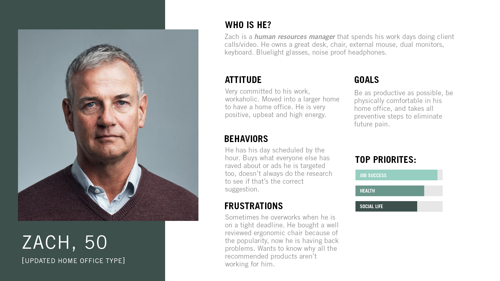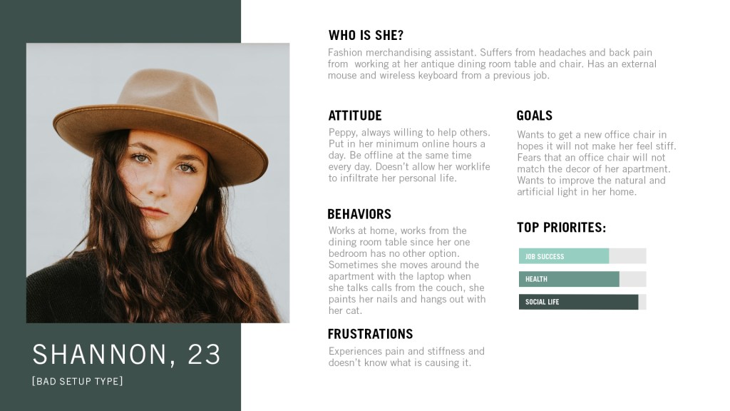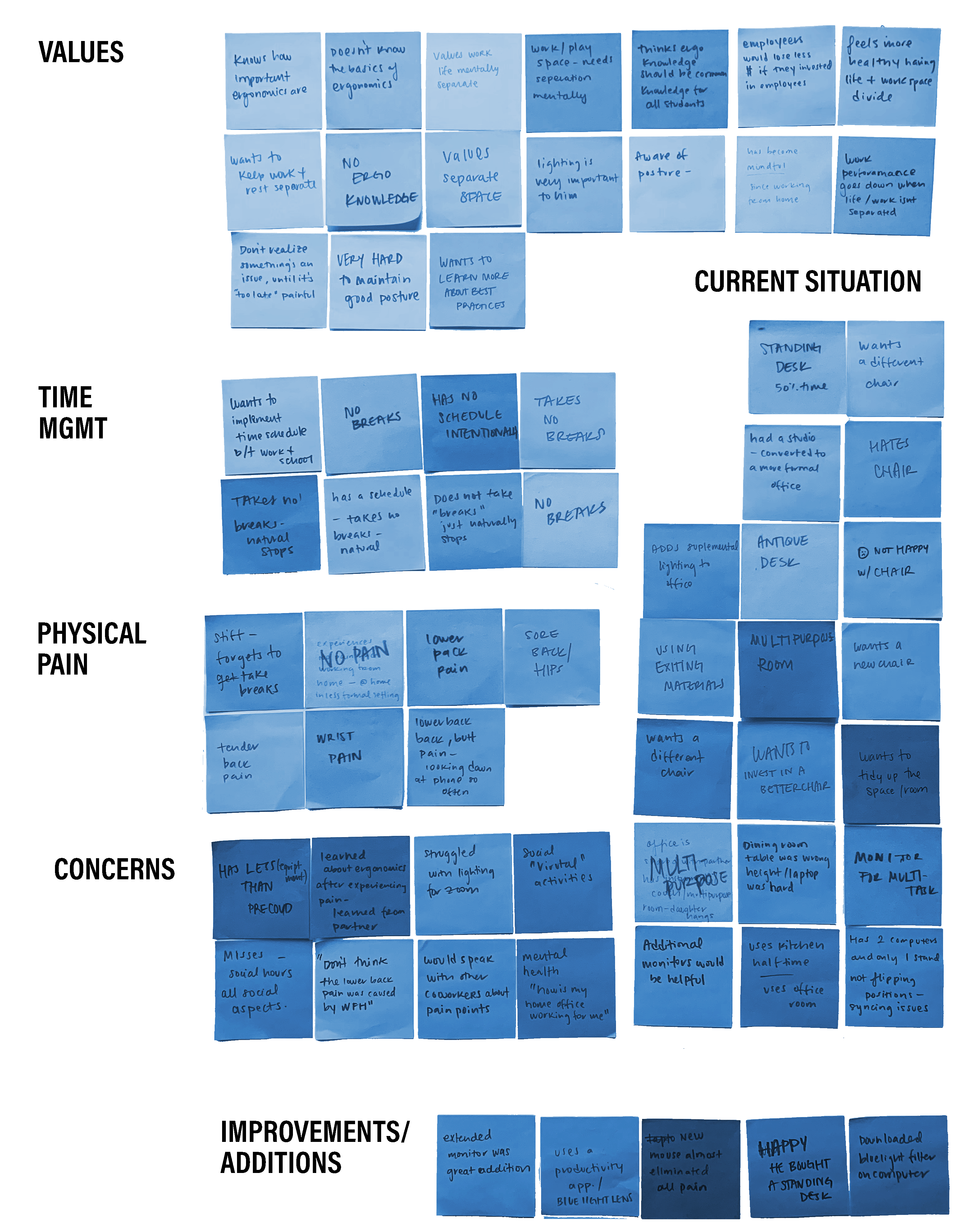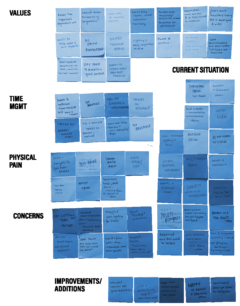Leveraging my online student community, I conducted a survey targeting people that were currently working from home. I asked them, if they were in pain from sitting all day? Did they have an understanding of ergonomics prior to working from home? What equipment did they have at home? How did they go about setting up their space?